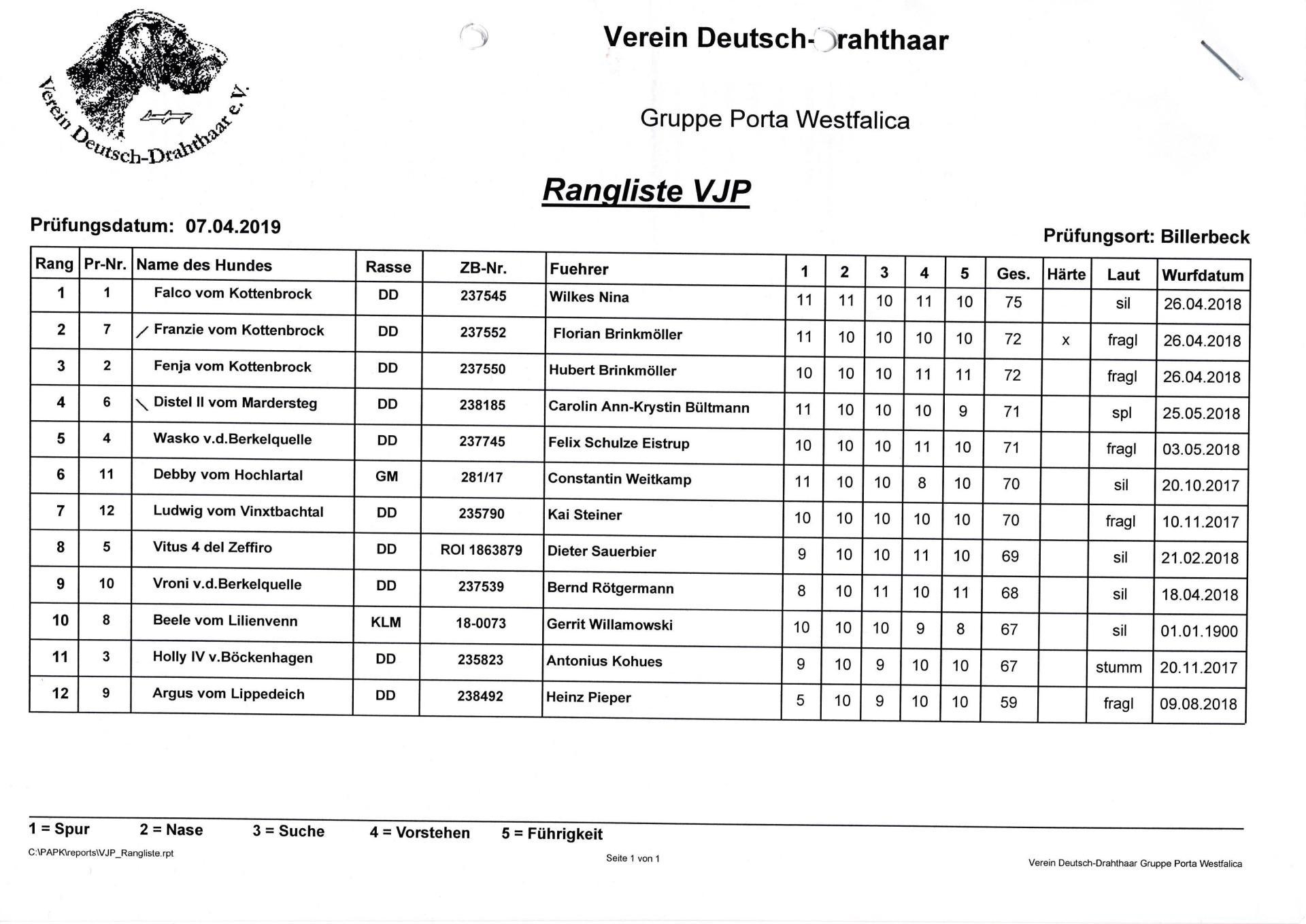 | 1 | Falco vom Kottenbrock | 75 | 185 | BTR, Härte, Armbr. Haltabz., Saujäger | |