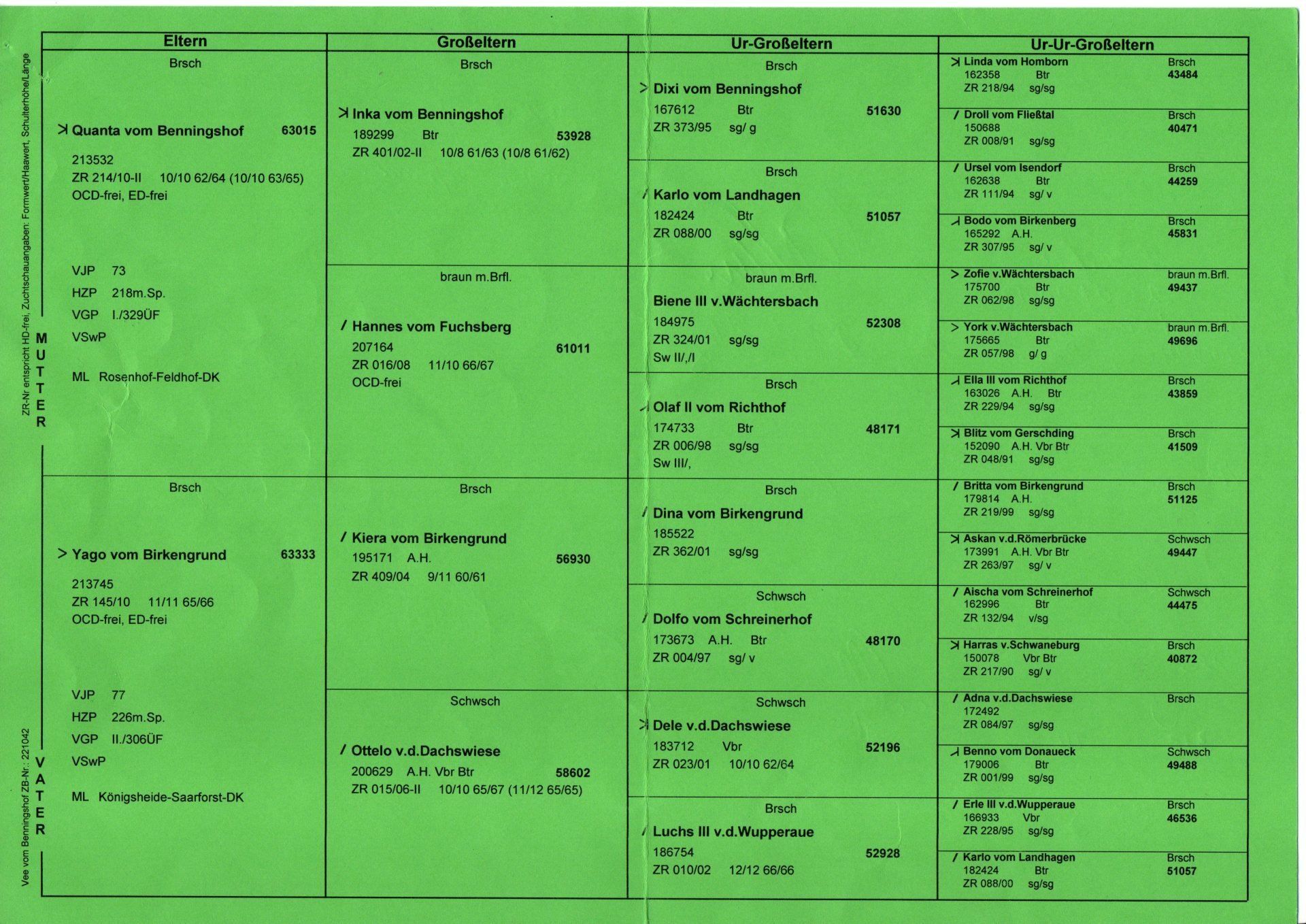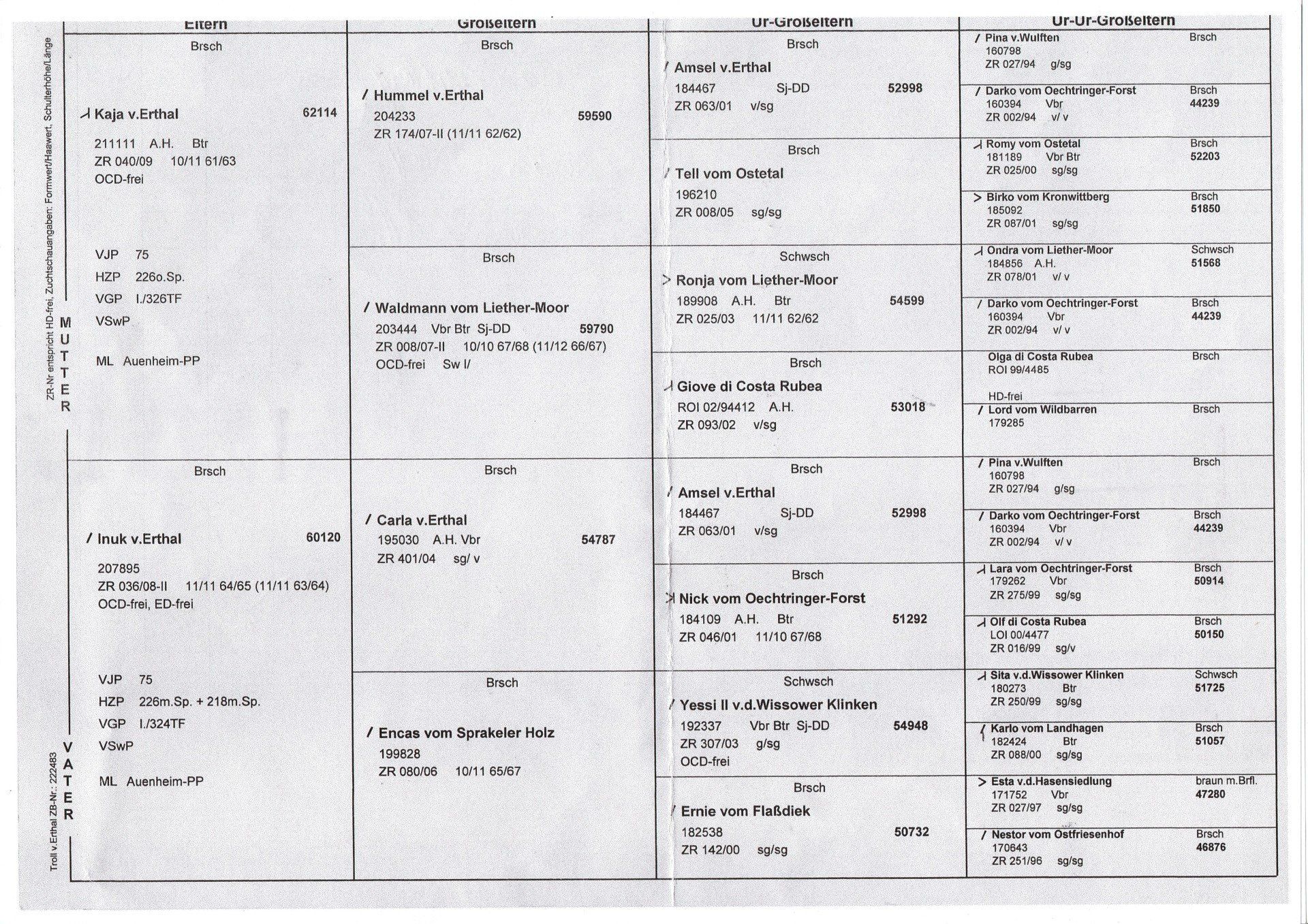 | 6 | Franzie vom Kottenbrock | 72 | 181 u. 174 | VGP, BTR, Härte | sg11/sg11 |